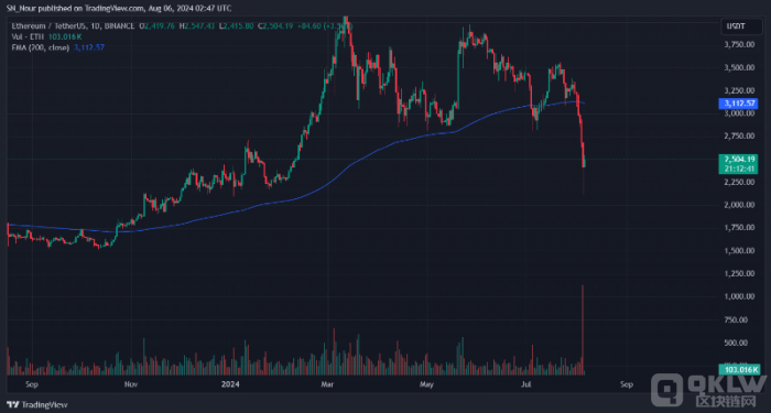 Ethereum市場遭遇了巨大的拋售壓力,主要來自少數(shù)做市商。據(jù)悉,他們共售出了約130,000枚ETH,價值約2.9億美元。這導(dǎo)致ETH價格在8月5日跌至2,100美元左右的低點(diǎn),并且該數(shù)字資產(chǎn)繼續(xù)低于其200天指數(shù)移動平均線。