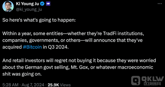 Ki Young Ju還預(yù)測(cè),未來(lái)一年內(nèi),包括傳統(tǒng)金融機(jī)構(gòu)、企業(yè)和政府部門在內(nèi)的部分組織可能會(huì)在其2024年第三季度的資產(chǎn)負(fù)債表中披露其Bitcoin持倉(cāng)情況。他補(bǔ)充道:“散戶投資者可能會(huì)因?yàn)閾?dān)憂德國(guó)政府拋售、Mt. Gox事件或其他宏觀經(jīng)濟(jì)問(wèn)題而后悔未能及時(shí)買入。”