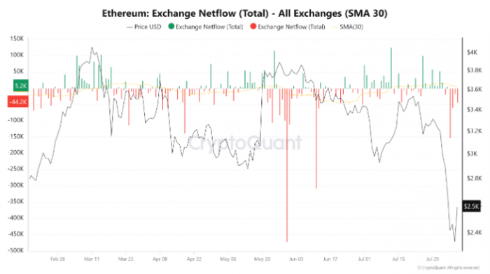 此外,Jump Trading 近期在將 ETH 轉(zhuǎn)移到交易所后,從幣安提取了3260萬(wàn)美元的 USDC,這表明該公司可能已出售了 ETH,并準(zhǔn)備從 Lido 提取剩余部分。根據(jù) CryptoQuant 的數(shù)據(jù),過(guò)去四天內(nèi),交易所繼續(xù)錄得 ETH 凈流出,表明買家正在吸收拋售壓力。