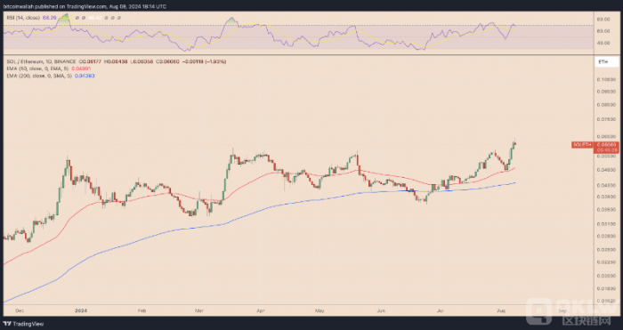 值得關注的是,Solana在近期超越了Ethereum。SOL/ETH交易對在過去24小時內上漲了10.75%,在8月9日達到了0.064 ETH的歷史新高。這一上漲恰逢Solana ETF在巴西上市,標志著Solana的市場認可度正在提升。