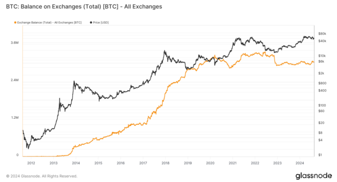 歷史數(shù)據(jù)顯示,交易所的Bitcoin余額可以有效反映市場情緒。2012年至2020年間,交易所持有的Bitcoin數(shù)量持續(xù)增加,顯示出Bitcoin供應(yīng)量的不斷增長。自2020年以來,市場走勢出現(xiàn)了較大波動,經(jīng)歷了吸籌與派發(fā)的階段。最近三年,Bitcoin余額的下降顯現(xiàn)出交易所對持有Bitcoin的態(tài)度變得更加謹慎。