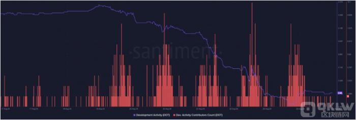 Santiment 的分析顯示,盡管開發(fā)者數(shù)量有所增加,但 DOT 的開發(fā)活動在過去 7 天內(nèi)出現(xiàn)了急劇下降。這一趨勢可能影響投資者對 Polkadot 的信心。