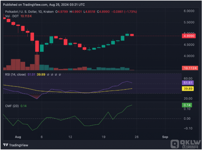 盡管面臨開發(fā)活躍度下降的挑戰(zhàn),DOT 的價格在上周仍上漲超過 11%。目前,DOT 的交易價格為 4.89 美元,市值超過 68 億美元,暫時位列第20大crypto。如果價格無法持續(xù)上漲,隨時可能跌出前20名。