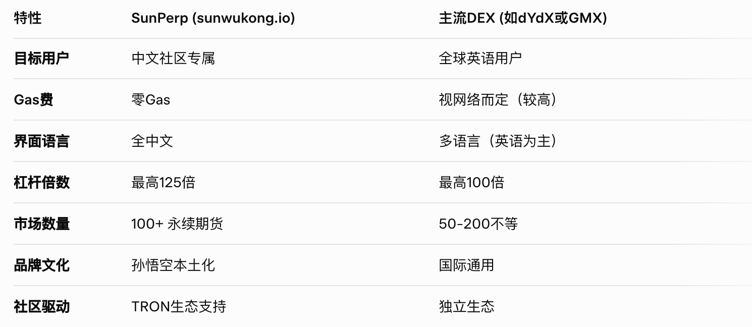 在競(jìng)爭(zhēng)激烈的DeFi市場(chǎng),SunPerp脫穎而出,得益于其獨(dú)特的定位和生態(tài)支持。以下表格對(duì)比了SunPerp與其他主流DEX的核心差異: