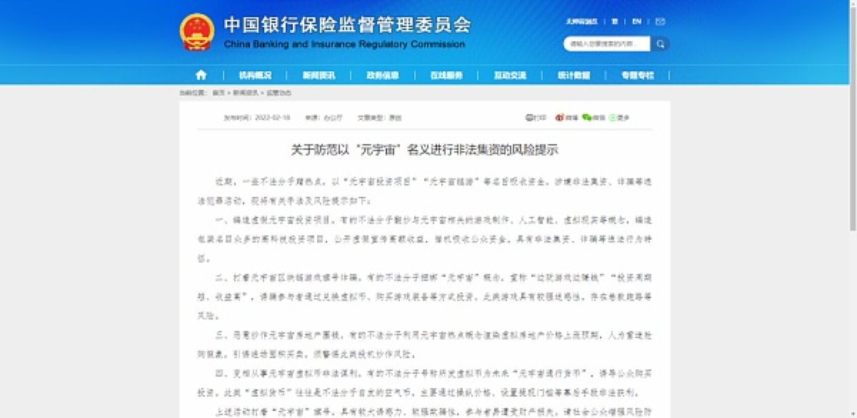 除了商標外,利用元宇宙非法集資也是重點監管對象。在今年年初,銀保監會官網發布消息,處置非法集資部際聯席會議辦公室發布關于防范以“元宇宙”名義進行非法集資的風險提示。