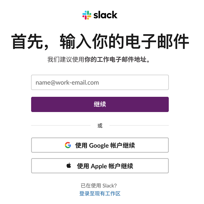 可以使用郵箱「前往這里注冊(cè) Slack 賬號(hào)」(可以使用企業(yè)郵箱 或 Gmail、Outlook 等,注意QQ 郵箱不支持),或者直接使用 Google、Apple 賬號(hào)進(jìn)行授權(quán)登錄。郵箱進(jìn)行注冊(cè),郵箱驗(yàn)證之后就能成功注冊(cè)。