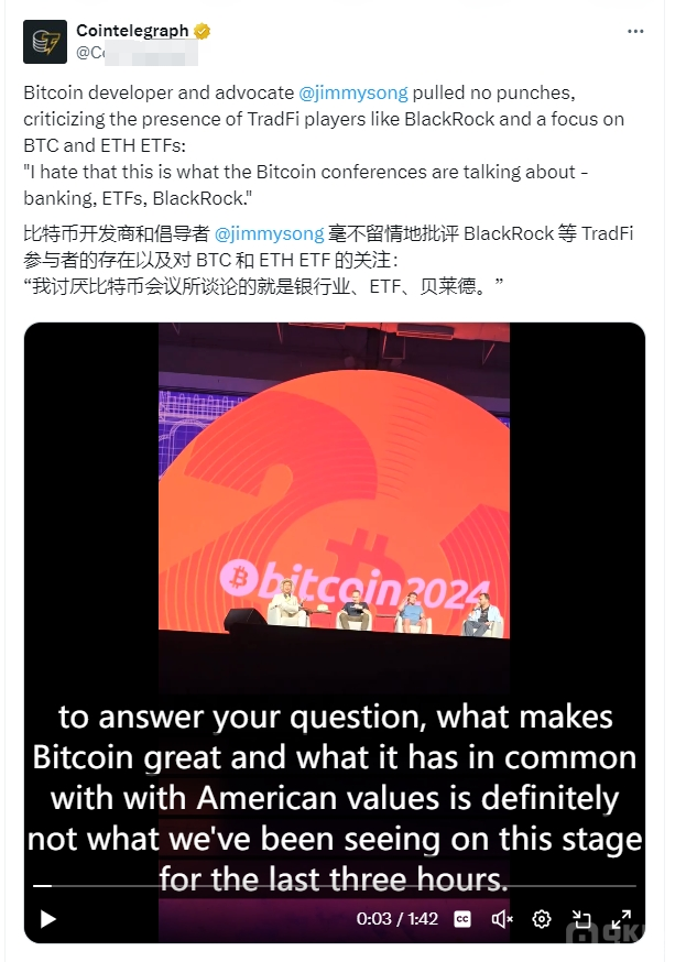 Song 還表示“我討厭這就是Bitcoin會(huì)議所討論的內(nèi)容。銀行、ETF、貝萊德。這些不是我的價(jià)值觀,這些不是Bitcoin的價(jià)值觀,這些不是美國(guó)的價(jià)值觀。”
