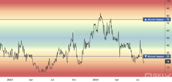 近期,山寨幣市場似乎恢復了上漲趨勢,但這種增長并未持續。山寨幣季節指數一度僅達到33,而要確認真正的山寨幣季節,該指數必須達到75,這意味著前50名山寨幣(不包括穩定幣)中至少有75%的表現優于Bitcoin。截至目前,該指數為18,上次達到這一水平是在6月20日和之前的2023年11月。這表明山寨幣在試圖超越Bitcoin的過程中遇到了困難,而Bitcoin最近繼續挑戰歷史高點的阻力。