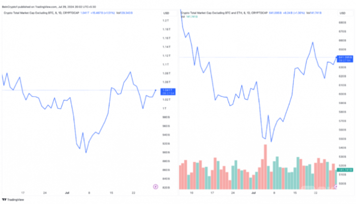 Bitcoin Magazine通過測試TOTAL2和TOTAL3結論是,無論ETH的表現如何,山寨幣季節都有可能到來。TOTAL2是排名前125名山寨幣的總市值,而TOTAL3是山寨幣減去ETH和BTC的市值。從數據趨勢來看,這兩者的市值趨勢相同,這意味著Ethereum價格可能不會像2021年那樣成為山寨幣季節的決定因素。