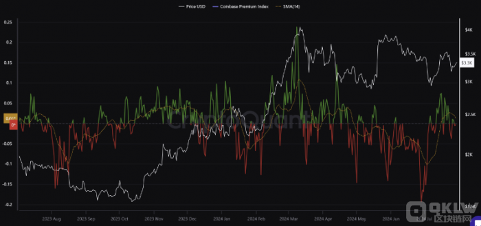 在2024年5月,EthereumETF的潛在批準曾一度提升了Coinbase上的現貨購買需求,對ETH價格產生了積極影響。當時,Coinbase溢價指數升至0.15以上。目前該指數正在下降,這對ETH價格產生了負面影響。